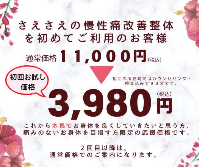 もしあなたが今、1ヶ月以上続いている身体の痛みなど辛い症状でお悩みでしたら、【慢性痛改善整体サロン さえさえ】にいらしてください。