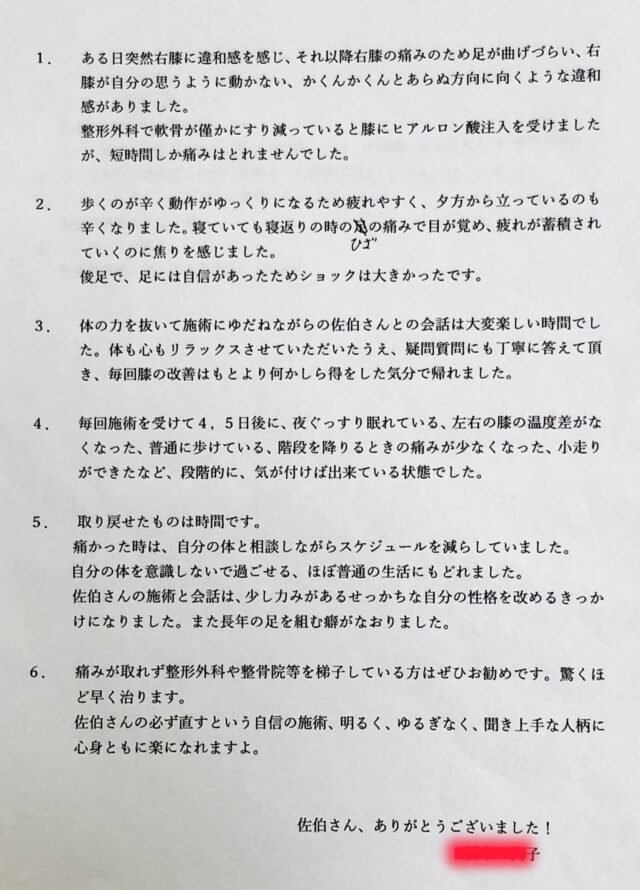 毎回施術を受けて4.5日後に、夜ぐっすり眠れている、左右の膝の温度差がなくなった、普通に歩けている、階段を降りるときの痛みが少なくなった、小走りができたなど、段階的に、気が付けば出来ている状態でした。